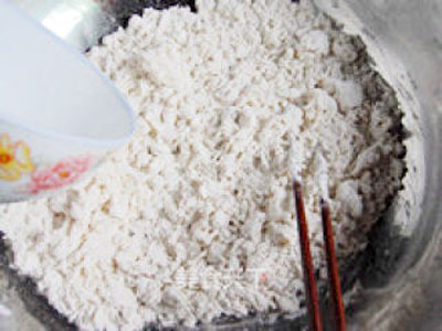 準(zhǔn)備一個(gè)不銹鋼盆放入500克面粉,將酵母倒進(jìn)30度左右的溫水里,用筷子攪拌融化,將酵母水倒入,邊倒入邊用筷子攪拌成絮狀。