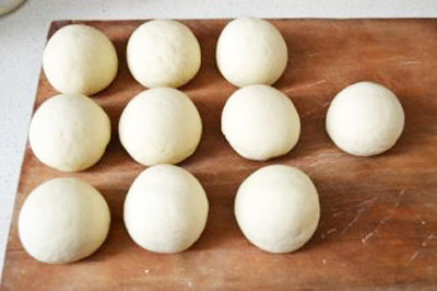 將發(fā)酵好的面團(tuán)取出放在案板上,揉面進(jìn)行排氣,揉至原來面團(tuán)的大小。把面團(tuán)揉成長條狀,用刀切成等份。將分好的等份面團(tuán)揉成饅頭形狀。